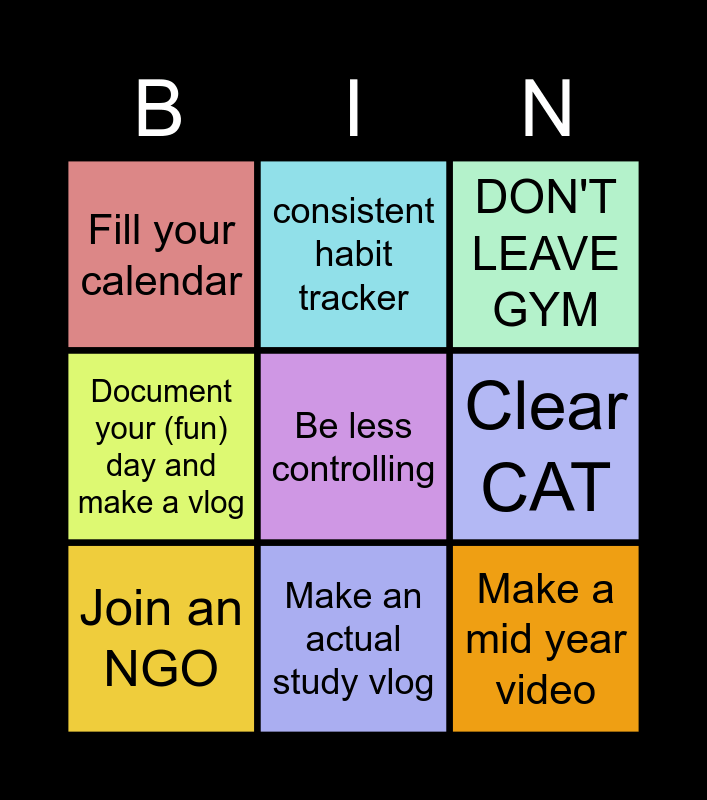 This bingo card has a free space and 8 words: Clear CAT, DON'T LEAVE GYM, consistent habit tracker, Join an NGO, Fill your calendar, Make a mid year video, Document your (fun) day and make a vlog and Make an actual study vlog.