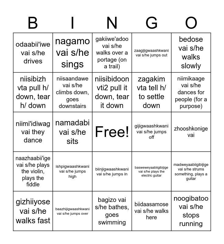 This bingo card has a free space and 43 words: maajiibatoo vai s/he starts to run, runs off, noogibatoo vai s/he stops running, bagamose vai s/he arrives walking, gizhiiyose vai s/he walks fast, ondose vai s/he walks from a certain place, biidaasamose vai s/he walks here, gakiiwe'adoo vai s/he walks over a portage (on a trail), wawaagizide'amii vai s/he walks pigeon-toed, bedose vai s/he walks slowly, baazhijigwaashkwani vai s/he jumps over, zaagijigwaashkwani vai s/he jumps out, gijigwaashkwani vai s/he jumps off, biinjigwaashkwani vai s/he jumps in, ishpigwaashkwani vai s/he jumps high, gwaashkwani vai s/he jumps, bagizo vai s/he bathes, goes swimming, niimi vai s/he dances, niimi'idiwag vai they dance, niimikaw vta dance for h/, niimikaage vai s/he dances for people (for a purpose), nagamo vai s/he sings, nagamotaw vta sing to h/, odaabii' vta drive h/, odaabii'iwe vai s/he drives, bakitejii'ige vai s/he plays baseball, zhooshkonige vai, baaga'adowe vai s/he plays lacrosse, gidochige vai [BL] s/he plays music, basweweyaabiigibijige vai s/he plays the electric guitar, naazhaabii'ige vai s/he plays the violin, plays the fiddle, bibigwe vai s/he plays the flute, madweyaabiigibijige vai s/he strums something, plays a guitar, odamino vai s/he plays, namadabi vai s/he sits, goshkwaawaadabi vai s/he stays somewhere quietly ; s/he sits quietly, sits still, bizaanaakwadabi vai s/he sits still, bizaanabi vai s/he sits still, niisibidoon vti2 pull it down, tear it down, niisibizh vta pull h/ down, tear h/ down, zagakim vta tell h/ to settle down, zhagashkitaa vai s/he crouches down, ducks down, stoops, niisaandawe vai s/he climbs down, goes downstairs and gawiweba'an vti knock it down (using something).