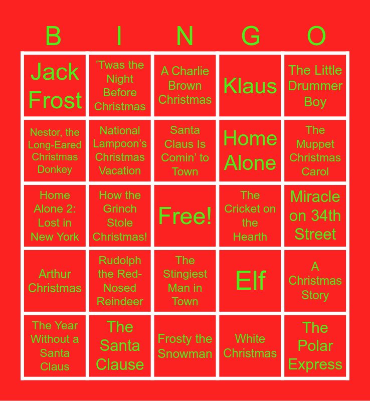 This bingo card has a free space and 25 words: Rudolph the Red-Nosed Reindeer, Frosty the Snowman, Santa Claus Is Comin’ to Town, The Year Without a Santa Claus, The Little Drummer Boy, Jack Frost, Nestor, the Long-Eared Christmas Donkey, ’Twas the Night Before Christmas, The Cricket on the Hearth, The Stingiest Man in Town, Home Alone, Home Alone 2: Lost in New York, Elf, A Christmas Story, National Lampoon’s Christmas Vacation, It’s a Wonderful Life, Miracle on 34th Street, A Charlie Brown Christmas, The Muppet Christmas Carol, How the Grinch Stole Christmas!, The Polar Express, The Santa Clause, Arthur Christmas, Klaus and White Christmas.