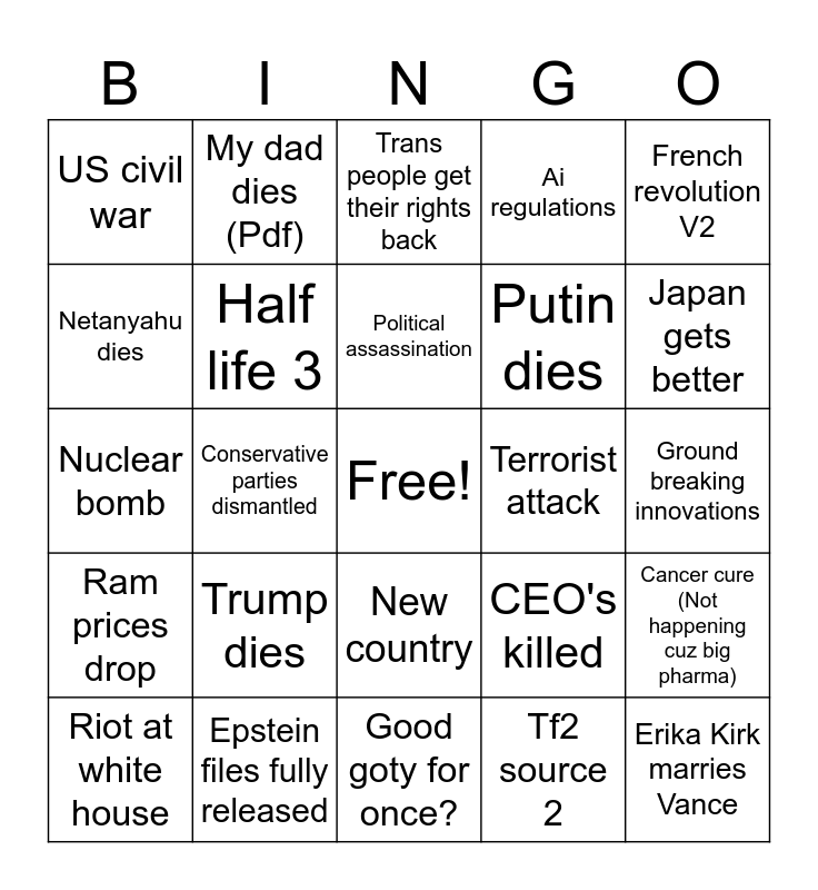 This bingo card has a free space and 24 words: Trump dies, Epstein files fully released, Political assassination, Riot at white house, French revolution V2, US civil war, Netanyahu dies, My dad dies (Pdf), Terrorist attack, New country, Putin dies, Nuclear bomb, CEO's killed, Cancer cure (Not happening cuz big pharma), Half life 3, Tf2 source 2, Ground breaking innovations, Trans people get their rights back, Japan gets better, Conservative parties dismantled, Erika Kirk marries Vance, Ram prices drop, Ai regulations and Good goty for once?.