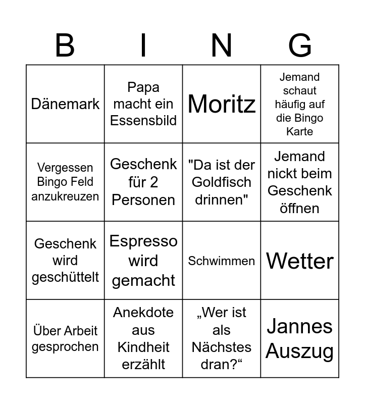 This bingo card has 16 words: Anekdote aus Kindheit erzählt, Wetter, Moritz, Dänemark, Geschenk wird geschüttelt, Papa macht ein Essensbild, Schwimmen, „Wer ist als Nächstes dran?“, Vergessen Bingo Feld anzukreuzen, Geschenk für 2 Personen, Über Arbeit gesprochen, Jemand schaut häufig auf die Bingo Karte, Espresso wird gemacht, Jemand nickt beim Geschenk öffnen, "Da ist der Goldfisch drinnen" and Jannes Auszug.