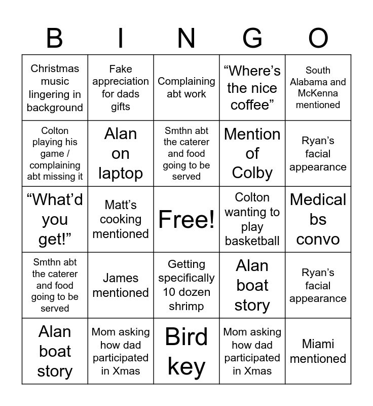 This bingo card has a free space and 48 words: Medical bs convo, Miami mentioned, Oak street, Bird key, James mentioned, Complaining abt work, Fake appreciation for dads gifts, “What’d you get!”, Colton playing his game / complaining abt missing it, Mom puts the fireplace background on TV, Alan on laptop, “Where’s the nice coffee”, Ryan’s facial appearance, Alan boat story, Conversation involving the Kreys, Getting specifically 10 dozen shrimp, Smthn abt the caterer and food going to be served, Colton wanting to play basketball, Golf conversation, South Alabama and McKenna mentioned, Matt’s cooking mentioned, Mom asking how dad participated in Xmas, Christmas music lingering in background, Mention of Colby, “Where’s the nice coffee”, Ryan’s facial appearance, Alan boat story, Conversation involving the Kreys, Getting specifically 10 dozen shrimp, Smthn abt the caterer and food going to be served, Colton wanting to play basketball, Golf conversation, South Alabama and McKenna mentioned, Matt’s cooking mentioned, Mom asking how dad participated in Xmas, Christmas music lingering in background, Mention of Colby, Medical bs convo, Miami mentioned, Oak street, Bird key, James mentioned, Complaining abt work, Fake appreciation for dads gifts, “What’d you get!”, Colton playing his game / complaining abt missing it, Mom puts the fireplace background on TV and Alan on laptop.