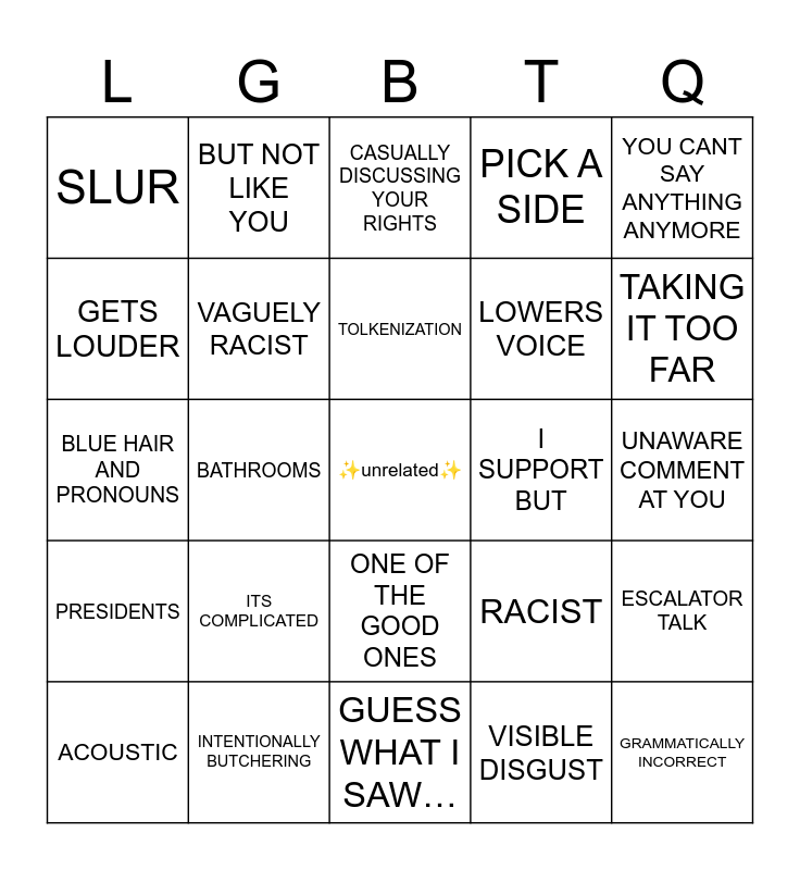 This bingo card has a free space and 36 words: ELON MUSK, THOSE ____, DOUBLE STANDARDS, VAGUELY RACIST, RACIST, PRESIDENTS, TOLKENIZATION, ABORTION, YOU CANT SAY ANYTHING ANYMORE, SPORTS, BATHROOMS, PICK A SIDE, YOUNGER GENERATION, I SUPPORT BUT, TAKING IT TOO FAR, SLUR, AIR QUOTES, ITS COMPLICATED, GRAMMATICALLY INCORRECT, CASUALLY DISCUSSING YOUR RIGHTS, UNAWARE COMMENT AT YOU, ESCALATOR TALK, INTENTIONALLY BUTCHERING, ACOUSTIC, GUESS WHAT I SAW…, BUT NOT LIKE YOU, BLUE HAIR AND PRONOUNS, INDOCTRINATION, LOWERS VOICE, GETS LOUDER, DISCUSSING ADS, PUBLIC PLACE, VISIBLE DISGUST, ONE OF THE GOOD ONES, CLOSETED and DEFINITELY AUTISTIC.