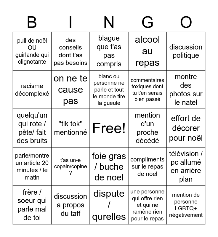This bingo card has a free space and 24 words: t'as un-e copain/copine ?, discussion a propos du taff, blanc ou personne ne parle et tout le monde tire la gueule, frère / soeur qui parle mal de toi, discussion politique, pull de noël OU guirlande qui clignotante, racisme décomplexé, des conseils dont t'as pas besoins, mention d'un proche décédé, foie gras / buche de noel, commentaires toxiques dont tu t'en serais bien passé, quelqu'un qui rote / pète/ fait des bruits, compliments sur le repas de noel, télévision / pc allumé en arrière plan, on ne te cause pas, une personne qui offre rien et qui ne ramène rien pour le repas, effort de décorer pour noël, blague que t'as pas compris, montre des photos sur le natel, ''tik tok'' mentionné, mention de personne LGBTQ+ négativement, parle/montre un article 20 minutes / le matin, alcool au repas and dispute / qurelles.