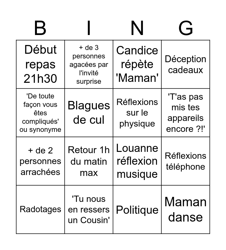 This bingo card has 16 words: 'Tu nous en ressers un Cousin', Réflexions téléphone, Candice répète 'Maman', Début repas 21h30, + de 2 personnes arrachées, + de 3 personnes agacées par l'invité surprise, Louanne réflexion musique, Politique, 'De toute façon vous êtes compliqués' ou synonyme, Blagues de cul, Radotages, Déception cadeaux, Retour 1h du matin max, 'T'as pas mis tes appareils encore ?!', Réflexions sur le physique and Maman danse.