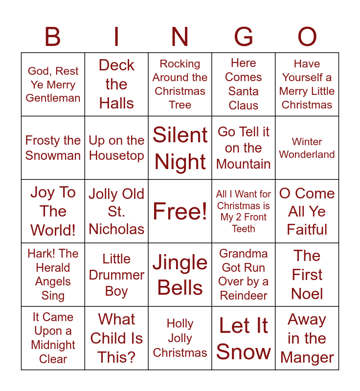 This bingo card has a free space and 24 words: Little Drummer Boy, What Child Is This?, Silent Night, It Came Upon a Midnight Clear, Have Yourself a Merry Little Christmas, God, Rest Ye Merry Gentleman, Frosty the Snowman, Deck the Halls, All I Want for Christmas is My 2 Front Teeth, Jingle Bells, Go Tell it on the Mountain, Joy To The World!, Grandma Got Run Over by a Reindeer, The First Noel, Up on the Housetop, Let It Snow, O Come All Ye Faitful, Rocking Around the Christmas Tree, Winter Wonderland, Jolly Old St. Nicholas, Away in the Manger, Hark! The Herald Angels Sing, Here Comes Santa Claus and Holly Jolly Christmas.