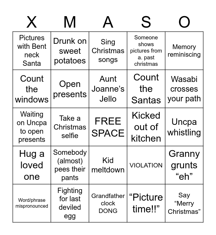 This bingo card has a free space and 24 words: Somebody (almost) pees their pants, Fighting for last deviled egg, Aunt Joanne’s Jello, Word/phrase mispronounced, Memory reminiscing, Pictures with Bent neck Santa, Count the windows, Drunk on sweet potatoes, Kicked out of kitchen, Kid meltdown, Count the Santas, Waiting on Uncpa to open presents, VIOLATION, Granny grunts “eh”, Open presents, “Picture time!!”, Uncpa whistling, Sing Christmas songs, Wasabi crosses your path, Take a Christmas selfie, Say “Merry Christmas”, Hug a loved one, Someone shows pictures from a. past christmas and Grandfather clock DONG.