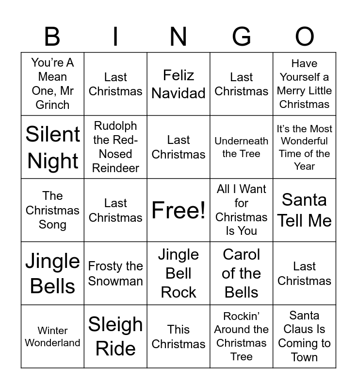 This bingo card has a free space and 29 words: Winter Wonderland, White Christmas, Last Christmas, Let It Snow!, You’re A Mean One, Mr Grinch, Feliz Navidad, Rudolph the Red-Nosed Reindeer, Frosty the Snowman, All I Want for Christmas Is You, Sleigh Ride, Santa Tell Me, Santa Claus Is Coming to Town, This Christmas, Rockin’ Around the Christmas Tree, It’s the Most Wonderful Time of the Year, Santa Baby, Jingle Bell Rock, Jingle Bells, Have Yourself a Merry Little Christmas, The Christmas Song, Carol of the Bells, Hallelujah, Underneath the Tree, Silent Night, Last Christmas, Last Christmas, Last Christmas, Last Christmas and Last Christmas.