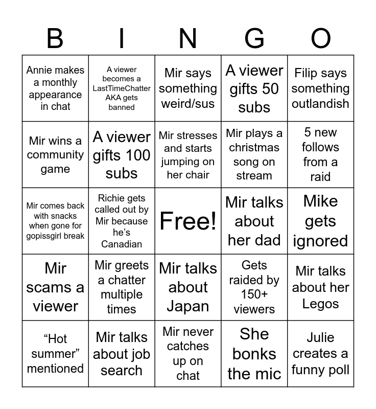 This bingo card has a free space and 24 words: “Hot summer” mentioned, Mir greets a chatter multiple times, Mir stresses and starts jumping on her chair, She bonks the mic, Filip says something outlandish, Annie makes a monthly appearance in chat, A viewer becomes a LastTimeChatter AKA gets banned, Mir says something weird/sus, Mir talks about her dad, Mike gets ignored, Mir comes back with snacks when gone for gopissgirl break, A viewer gifts 100 subs, Gets raided by 150+ viewers, Mir talks about her Legos, Mir wins a community game, Mir talks about job search, Mir never catches up on chat, A viewer gifts 50 subs, 5 new follows from a raid, Mir scams a viewer, Richie gets called out by Mir because he’s Canadian, Mir talks about Japan, Mir plays a christmas song on stream and Julie creates a funny poll.