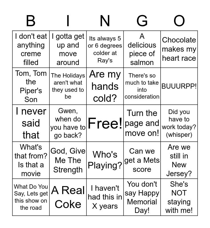 This bingo card has a free space and 24 words: God, Give Me The Strength, A Real Coke, Are my hands cold?, What Do You Say, Lets get this show on the road, Chocolate makes my heart race, I don't eat anything creme filled, Tom, Tom the Piper's Son, I gotta get up and move around, Turn the page and move on!, Who's Playing?, There's so much to take into consideration, I never said that, Can we get a Mets score, Are we still in New Jersey?, The Holidays aren't what they used to be, You don't say Happy Memorial Day!, Did you have to work today? (whisper), Its always 5 or 6 degrees colder at Ray's, BUUURPP!, Gwen, when do you have to go back?, She's NOT staying with me!, What's that from? Is that a movie, A delicious piece of salmon and I haven't had this in X years.