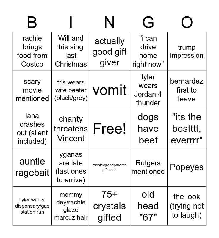 This bingo card has a free space and 25 words: yganas are late (last ones to arrive), 75+ crystals gifted, vomit, tyler wants dispensary/gas station run, trump impression, rachie brings food from Costco, scary movie mentioned, Will and tris sing last Christmas, dogs have beef, rachie/grandparents gift cash, tyler wears Jordan 4 thunder, lana crashes out (silent included), Rutgers mentioned, Popeyes, tris wears wife beater (black/grey), Byron "youve grown" talk, "its the bestttt, everrrr", actually good gift giver, bernardez first to leave, chanty threatens Vincent, the look (trying not to laugh), mommy dey/rachie glaze marcuz hair, auntie ragebait, "i can drive home right now" and old head "67".