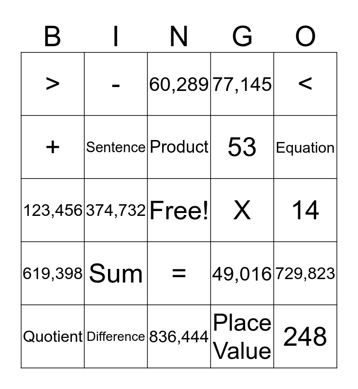 This bingo card has a free space and 24 words: Sum, Difference, Product, Quotient, <, >, +, -, X, =, 53, 123,456, 49,016, 729,823, Sentence, Place Value, 14, 60,289, Equation, 374,732, 248, 619,398, 77,145 and 836,444.