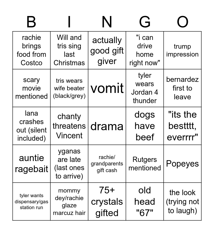 This bingo card has a free space and 25 words: yganas are late (last ones to arrive), 75+ crystals gifted, vomit, tyler wants dispensary/gas station run, trump impression, rachie brings food from Costco, scary movie mentioned, Will and tris sing last Christmas, dogs have beef, rachie/ grandparents gift cash, tyler wears Jordan 4 thunder, lana crashes out (silent included), Rutgers mentioned, Popeyes, tris wears wife beater (black/grey), Byron "youve grown" talk, "its the bestttt, everrrr", actually good gift giver, bernardez first to leave, chanty threatens Vincent, the look (trying not to laugh), mommy dey/rachie glaze marcuz hair, auntie ragebait, "i can drive home right now" and old head "67".