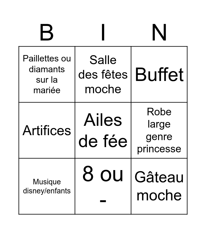 This bingo card has a free space and 8 words: Robe large genre princesse, Buffet, Salle des fêtes moche, Musique disney/enfants, Paillettes ou diamants sur la mariée, Gâteau moche, Artifices and 8 ou -.