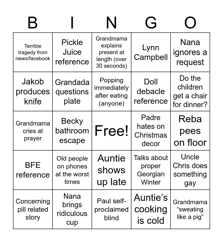 This bingo card has a free space and 34 words: Auntie’s cooking is dry, Grandma talks abt pie recipe, Grandada eats pie he shouldn’t, Sitting on floor kills Jakob painfully, Reba pees on floor, Jakob produces knife, Grandada questions plate, Paul self-proclaimed blind, Doll debacle reference, Grandmama “sweating like a pig”, Grandmama cries at prayer, Pickle Juice reference, Auntie’s cooking is cold, Nana shows up way too early, BFE reference, Becky bathroom escape, Auntie shows up late, Padre hates on Christmas decor, Uncle Chris does something gay, Concerning pill related story, Nana brings ridiculous cup, Grandmama explains dressing recipe, Lynn Campbell, Do the children get a chair for dinner?, Uncle Chris trips, Old people on phones at the worst times, Grandmama explains present at length (over 30 seconds), Grandada asks about bottles, Nana ignores a request, Terrible tragedy from news/facebook, “Did you hear about…”, Popping immediately after eating (anyone), Talks about proper Georgian Winter and Someone forgets their dishes at the wrong house.