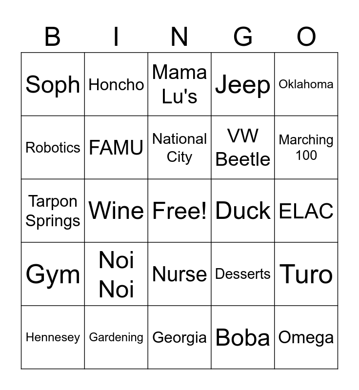 This bingo card has a free space and 65 words: Auntie Showa, Meatball, Honey, Turo, Air Force, Grandpa's Curry, Honcho, The Bronx, National City, Gracie, Nurse, NYC, ELAC, Oklahoma, Barona Casino, Robotics, Wine, Soph, Carne Asada Fries, VW Beetle, Noi Noi, Gym, Jeep, Cheesecake, Legos, Tessy, Tattoos, Yum Yum Donuts, Omega, One of the Carolinas, I think, Hennesey, Paw Patrol, Nurse Practitioner, Saints, Desserts, Gardening, Anime, Tarpon Springs, Boba, Triple Espresso, FAMU, Belmont Park, Duck, Scripps, Pomona, Roblox, Marching 100, Tita's Kitchenette, Jack in the Box, Nike, Ravenclaw, California, Florida, Georgia, New York, Hike, Clock It, Mama Lu's, Santa, Christmas, Plaza Bonita, Royal Mandarin, Panda Palace, Swap Meet and Food Truck.
