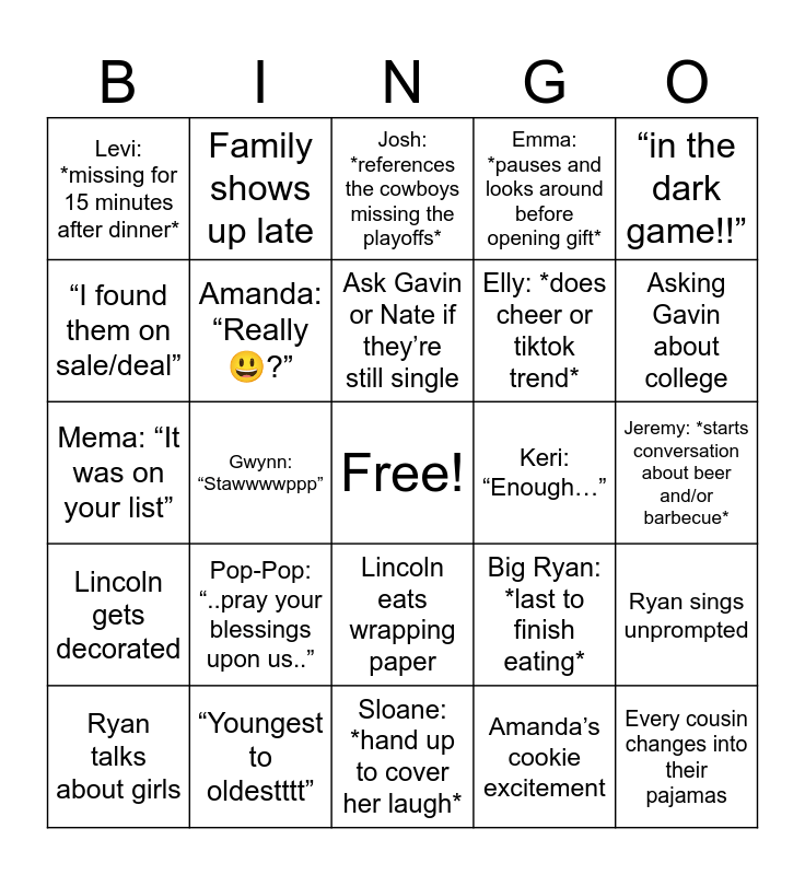 This bingo card has a free space and 29 words: Ryan talks about girls, Mema: “The fact of the matter is…”, Gwynn: “Stawwwwppp”, Makenna: *shows the table something on her phone*, Levi: *missing for 15 minutes after dinner*, Josh: *references the cowboys missing the playoffs*, Amanda: “Really 😃?”, Pop-Pop: “..pray your blessings upon us..”, Keri: “Enough…”, “Youngest to oldestttt”, Jeremy: *starts conversation about beer and/or barbecue*, Every cousin changes into their pajamas, Sloane: *hand up to cover her laugh*, Amanda’s cookie excitement, Asking Gavin about college, Asking Nate about college, Lincoln eats wrapping paper, Lincoln gets decorated, “in the dark game!!”, Mema: “It was on your list”, Big Ryan: *last to finish eating*, “Adults should go first”, Elly: *does cheer or tiktok trend*, “I found them on sale/deal”, Emma: *pauses and looks around before opening gift*, Family shows up late, Ryan sings unprompted, Ask Gavin or Nate if they’re still single and Bill: *any reference to basketball (FCA or LVA)*.