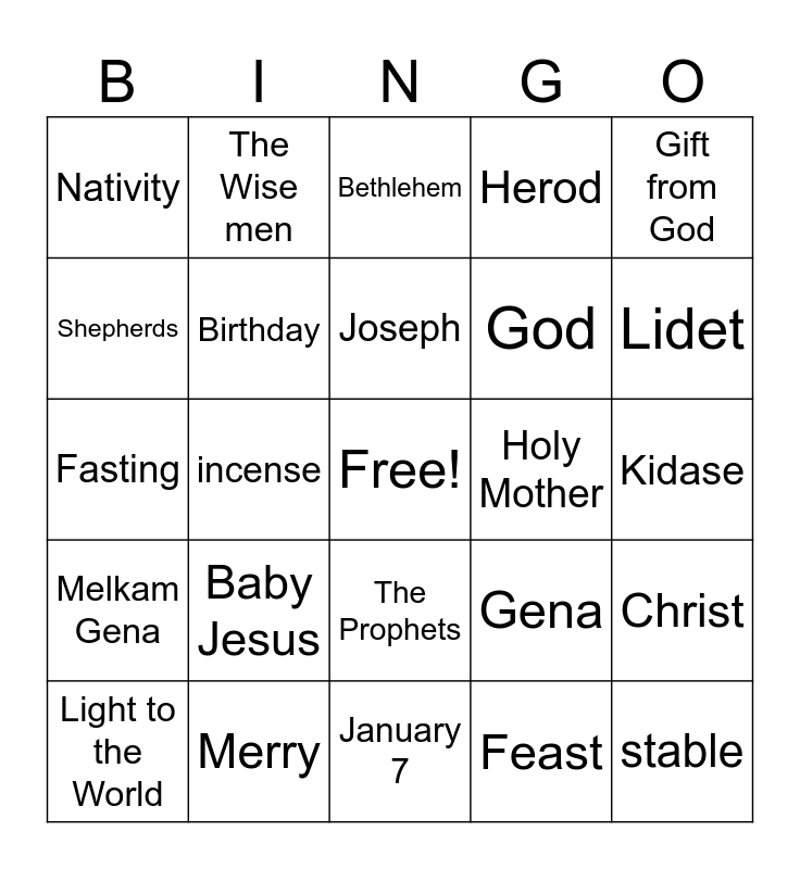 This bingo card has a free space and 24 words: Baby Jesus, Merry, Joseph, Light to the World, Gift from God, Nativity, Shepherds, The Wise men, Holy Mother, The Prophets, God, Fasting, Gena, Christ, Birthday, Feast, Kidase, Bethlehem, Lidet, incense, stable, Melkam Gena, Herod and January 7.