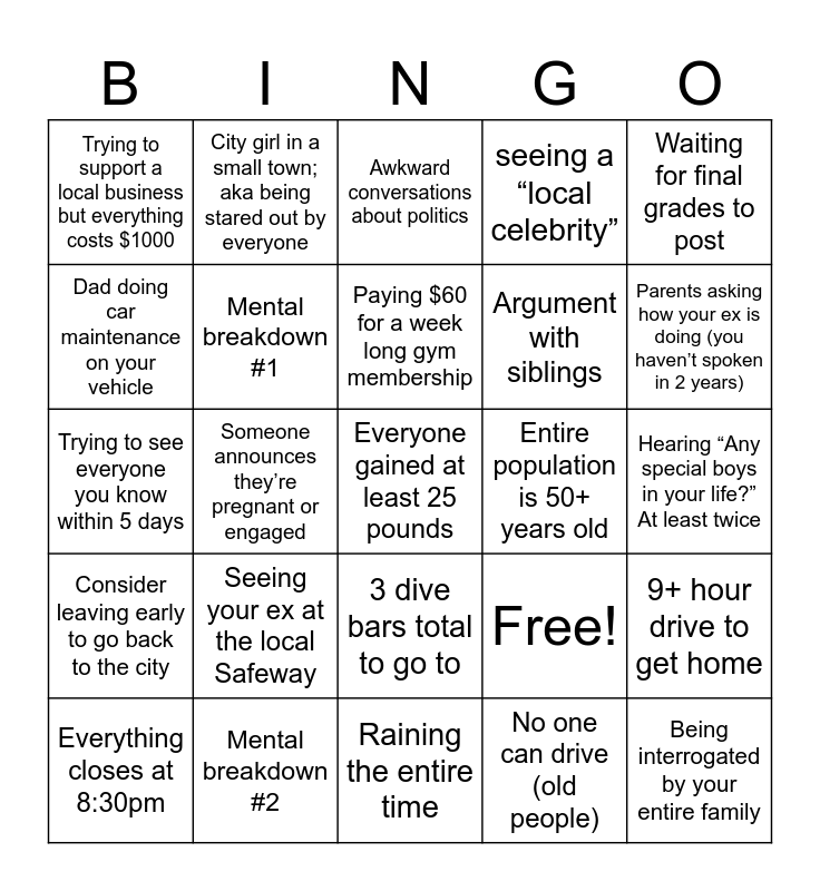 This bingo card has 25 words: Seeing your ex at the local Safeway, Raining the entire time, Paying $60 for a week long gym membership, Everything closes at 8:30pm, Waiting for final grades to post, Trying to support a local business but everything costs $1000, Dad doing car maintenance on your vehicle, City girl in a small town; aka being stared out by everyone, Entire population is 50+ years old, 3 dive bars total to go to, Argument with siblings, Trying to see everyone you know within 5 days, Free!, 9+ hour drive to get home, Mental breakdown #1, Being interrogated by your entire family, Hearing “Any special boys in your life?” At least twice, Awkward conversations about politics, Parents asking how your ex is doing (you haven’t spoken in 2 years), Someone announces they’re pregnant or engaged, Everyone gained at least 25 pounds, Mental breakdown #2, Consider leaving early to go back to the city, seeing a “local celebrity” and No one can drive (old people).