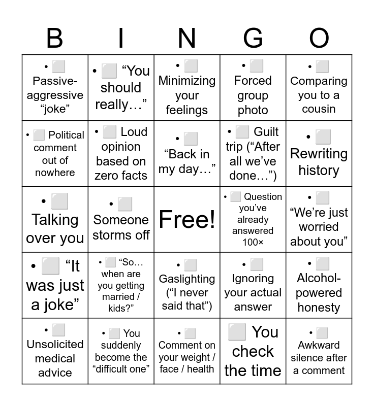 This bingo card has a free space and 25 words: • ⬜ “So… when are you getting married / kids?”, • ⬜ Comment on your weight / face / health, • ⬜ “Back in my day…”, • ⬜ Unsolicited medical advice, • ⬜ Comparing you to a cousin, • ⬜ Passive-aggressive “joke”, • ⬜ Political comment out of nowhere, • ⬜ “You should really…”, • ⬜ Question you’ve already answered 100×, • ⬜ Gaslighting (“I never said that”), • ⬜ Guilt trip (“After all we’ve done…”), • ⬜ Talking over you, • ⬜ Ignoring your actual answer, • ⬜ Alcohol-powered honesty, • ⬜ Loud opinion based on zero facts, • ⬜ Family secret accidentally revealed, • ⬜ “We’re just worried about you”, • ⬜ Minimizing your feelings, • ⬜ Rewriting history, • ⬜ Someone storms off, • ⬜ Awkward silence after a comment, • ⬜ You suddenly become the “difficult one”, • ⬜ “It was just a joke”, • ⬜ Forced group photo and ⬜ You check the time.