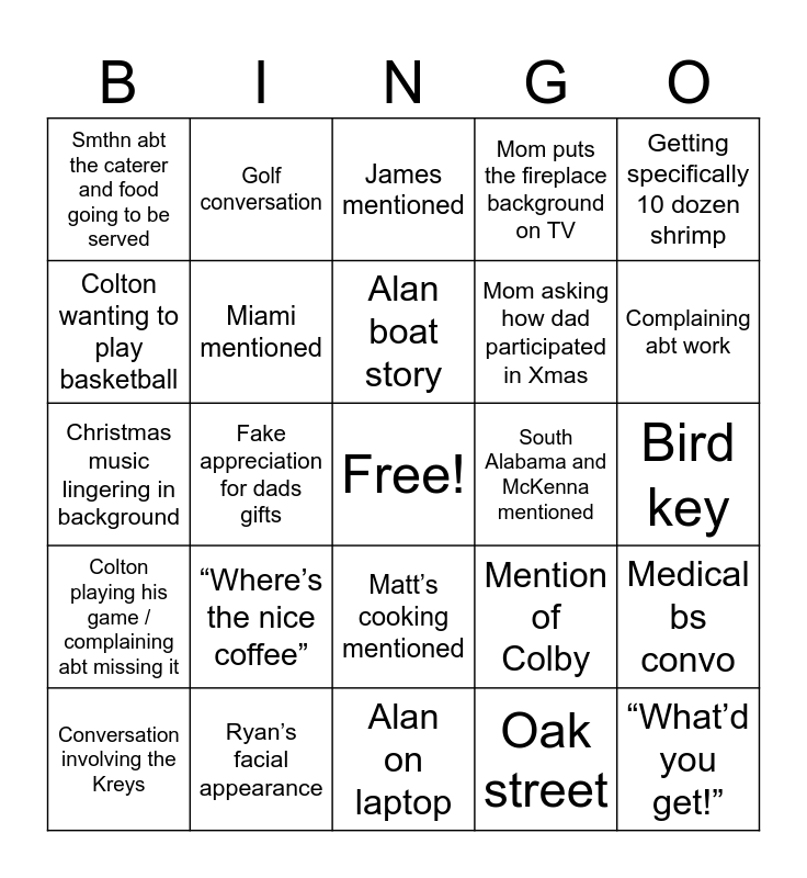This bingo card has a free space and 24 words: “Where’s the nice coffee”, Ryan’s facial appearance, Alan boat story, Conversation involving the Kreys, Getting specifically 10 dozen shrimp, Smthn abt the caterer and food going to be served, Colton wanting to play basketball, Golf conversation, South Alabama and McKenna mentioned, Matt’s cooking mentioned, Mom asking how dad participated in Xmas, Christmas music lingering in background, Mention of Colby, Medical bs convo, Miami mentioned, Oak street, Bird key, James mentioned, Complaining abt work, Fake appreciation for dads gifts, “What’d you get!”, Colton playing his game / complaining abt missing it, Mom puts the fireplace background on TV and Alan on laptop.