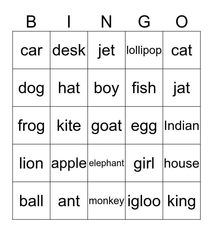This bingo card has a free space and 24 words: apple, ant, boy, ball, cat, car, dog, desk, egg, elephant, fish, frog, girl, house, hat, igloo, Indian, jet, jat, kite, king, lion, lollipop and monkey.