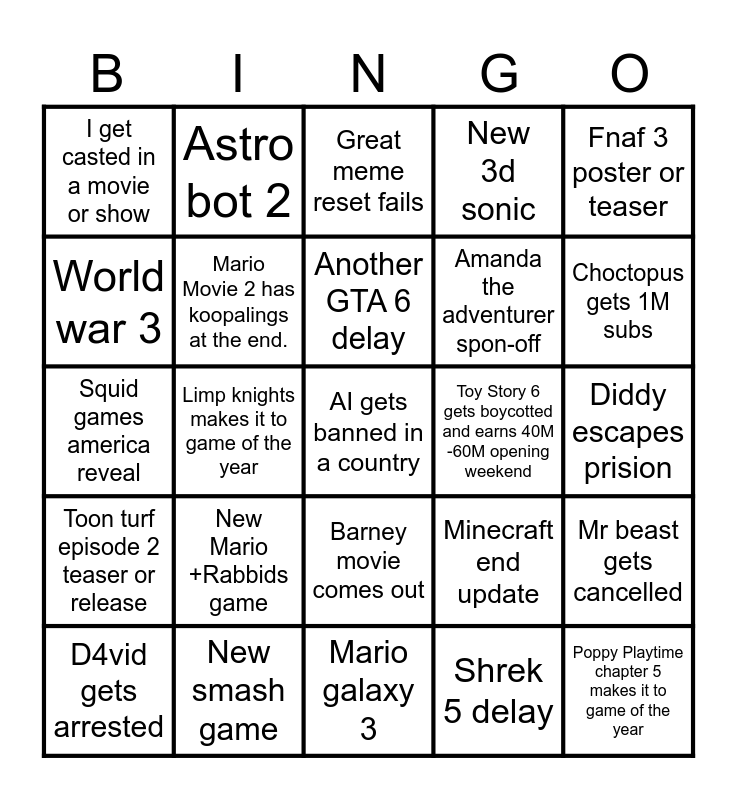 This bingo card has a free space and 24 words: D4vid gets arrested, New Mario +Rabbids game, Another GTA 6 delay, Shrek 5 delay, Fnaf 3 poster or teaser, I get casted in a movie or show, Astro bot 2, Great meme reset fails, Toy Story 6 gets boycotted and earns 40M -60M opening weekend, Diddy escapes prision, Squid games america reveal, Mario Movie 2 has koopalings at the end., Minecraft end update, Mr beast gets cancelled, World war 3, New smash game, Mario galaxy 3, New 3d sonic, Choctopus gets 1M subs, Toon turf episode 2 teaser or release, Limp knights makes it to game of the year, Barney movie comes out, Amanda the adventurer spon-off and Poppy Playtime chapter 5 makes it to game of the year.