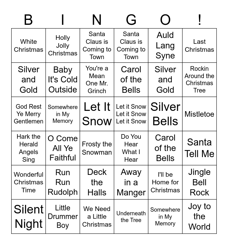 ⚠ This card has duplicate items: Holly Jolly Christmas (2), Rockin Around the Christmas Tree (2), Somewhere in My Memory (2), Run Run Rudolph (2), It's Beginning to Look A Lot Like Christmas (2), Santa Claus is Coming to Town (2), Baby It's Cold Outside (2), You're a Mean One Mr. Grinch (2), Where Are You Christmas (2), Frosty the Snowman (2), Deck the Halls (2), Carol of the Bells (2), White Christmas (2), The Christmas Song (Chestnuts Roasting on an Open Fire) (2), Silver and Gold (2), Hark the Herald Angels Sing (2), Auld Lang Syne (2), Pennies From Heaven (2), Let It Snow (2), Silver Bells (2)