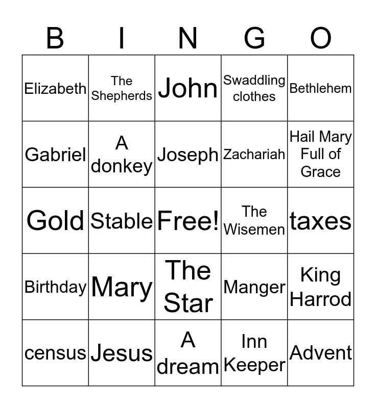 This bingo card has a free space and 24 words: Mary, Jesus, Joseph, census, Bethlehem, Elizabeth, Gabriel, The Shepherds, The Wisemen, The Star, Zachariah, Gold, Manger, King Harrod, A donkey, Inn Keeper, taxes, John, Hail Mary Full of Grace, Stable, Advent, Birthday, Swaddling clothes and A dream.