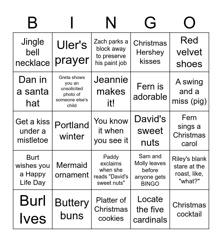 This bingo card has a free space and 24 words: Mermaid ornament, Buttery buns, Jeannie makes it!, Burl Ives, Red velvet shoes, Jingle bell necklace, Dan in a santa hat, Uler's prayer, David's sweet nuts, Paddy exclaims when she reads "David's sweet nuts", Fern is adorable, Get a kiss under a mistletoe, Sam and Molly leaves before anyone gets BINGO, Riley's blank stare at the roast, like, "what?", Greta shows you an unsolicited photo of someone else's child, Locate the five cardinals, Fern sings a Christmas carol, Zach parks a block away to preserve his paint job, A swing and a miss (pig), Portland winter, Christmas cocktail, Burt wishes you a Happy Life Day, Christmas Hershey kisses and Platter of Christmas cookies.