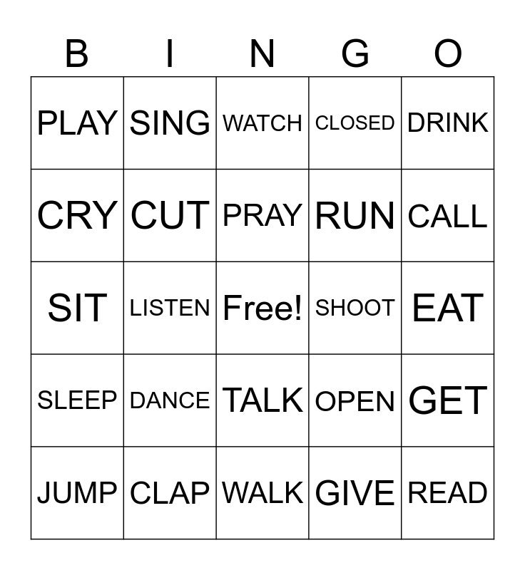 This bingo card has a free space and 24 words: JUMP, DANCE, PRAY, GIVE, DRINK, PLAY, SING, WATCH, SHOOT, EAT, SIT, CUT, OPEN, GET, CRY, CLAP, WALK, CLOSED, CALL, SLEEP, LISTEN, TALK, RUN and READ.