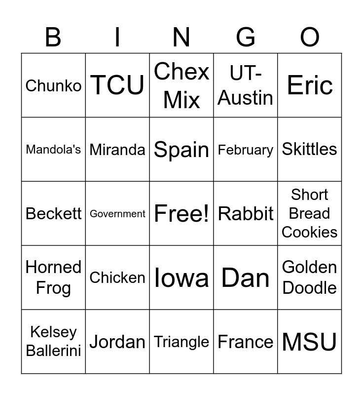This bingo card has a free space and 50 words: Bear, MSU, San Antonio, Triangle, Chicken, Ben, TCU, Italy, Mandola's, Diana, Miranda, UT-Austin, Golden Doodle, Dan, Cindy, PhD, Spain, Rabbit, Dave's, Eric, Government, France, Chunko, February, May, October, Skittles, Swedish Fish, Chex Mix, Iowa, Illinois, June, Bailey, Jen, Jordan, Eli, Kai, Dog Park, Jackie's, Short Bread Cookies, Basket ball, Soccer, Football, Taylor Swift, Kelsey Ballerini, Beckett, Case Hall, Texas Longhorn, Horned Frog and Spartan.