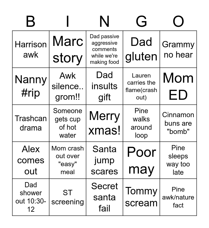 This bingo card has a free space and 24 words: Dad shower out 10:30-12, Mom crash out over "easy" meal, Dad insults gift, Tommy scream, Grammy no hear, Harrison awk, Marc story, Dad passive aggressive comments while we're making food, Pine walks around loop, Cinnamon buns are "bomb", Trashcan drama, Awk silence.. grom!!, Poor may, Pine sleeps way too late, Nanny #rip, ST screening, Secret santa fail, Dad gluten, Mom ED, Alex comes out, Someone gets cup of hot water, Santa jump scares, Lauren carries the flame(crash out) and Pine awk/nature fact.