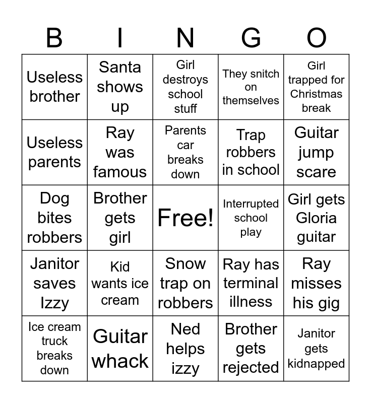 This bingo card has a free space and 24 words: Kid wants ice cream, Guitar whack, Parents car breaks down, Ice cream truck breaks down, Girl trapped for Christmas break, Useless brother, Useless parents, Santa shows up, Interrupted school play, Snow trap on robbers, Trap robbers in school, Dog bites robbers, Ray has terminal illness, Ray misses his gig, Ray was famous, Brother gets rejected, Girl gets Gloria guitar, Girl destroys school stuff, Guitar jump scare, Brother gets girl, Janitor gets kidnapped, Janitor saves Izzy, They snitch on themselves and Ned helps izzy.