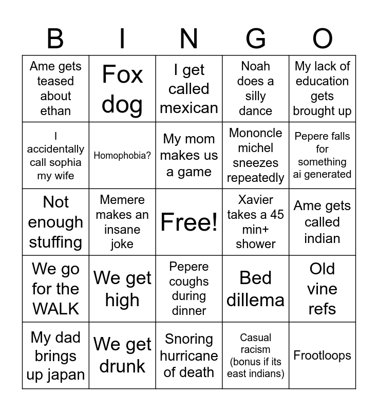 This bingo card has a free space and 24 words: We get high, We get drunk, My mom makes us a game, My dad brings up japan, My lack of education gets brought up, Ame gets teased about ethan, I accidentally call sophia my wife, Fox dog, Xavier takes a 45 min+ shower, Pepere coughs during dinner, Mononcle michel sneezes repeatedly, Not enough stuffing, Bed dillema, Old vine refs, Homophobia?, Casual racism (bonus if its east indians), Ame gets called indian, I get called mexican, Pepere falls for something ai generated, Memere makes an insane joke, Frootloops, We go for the WALK, Noah does a silly dance and Snoring hurricane of death.