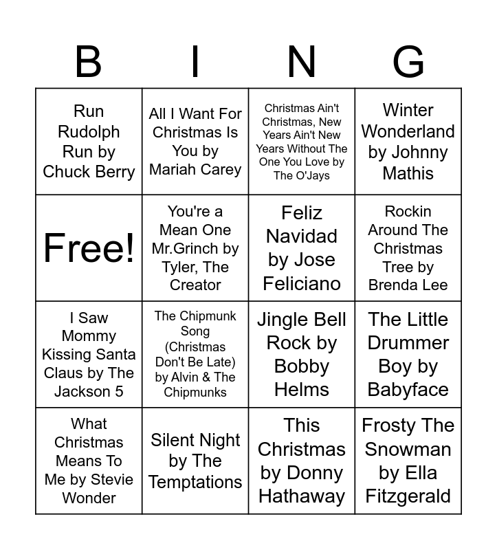This bingo card has 17 words: What Christmas Means To Me by Stevie Wonder, Silent Night by The Temptations, Christmas Ain't Christmas, New Years Ain't New Years Without The One You Love by The O'Jays, Winter Wonderland by Johnny Mathis, I Saw Mommy Kissing Santa Claus by The Jackson 5, You're a Mean One Mr.Grinch by Tyler, The Creator, Jingle Bell Rock by Bobby Helms, Rockin Around The Christmas Tree by Brenda Lee, Free!, The Chipmunk Song (Christmas Don't Be Late) by Alvin & The Chipmunks, This Christmas by Donny Hathaway, The Little Drummer Boy by Babyface, Run Rudolph Run by Chuck Berry, All I Want For Christmas Is You by Mariah Carey, Feliz Navidad by Jose Feliciano, Frosty The Snowman by Ella Fitzgerald and Santa Baby.