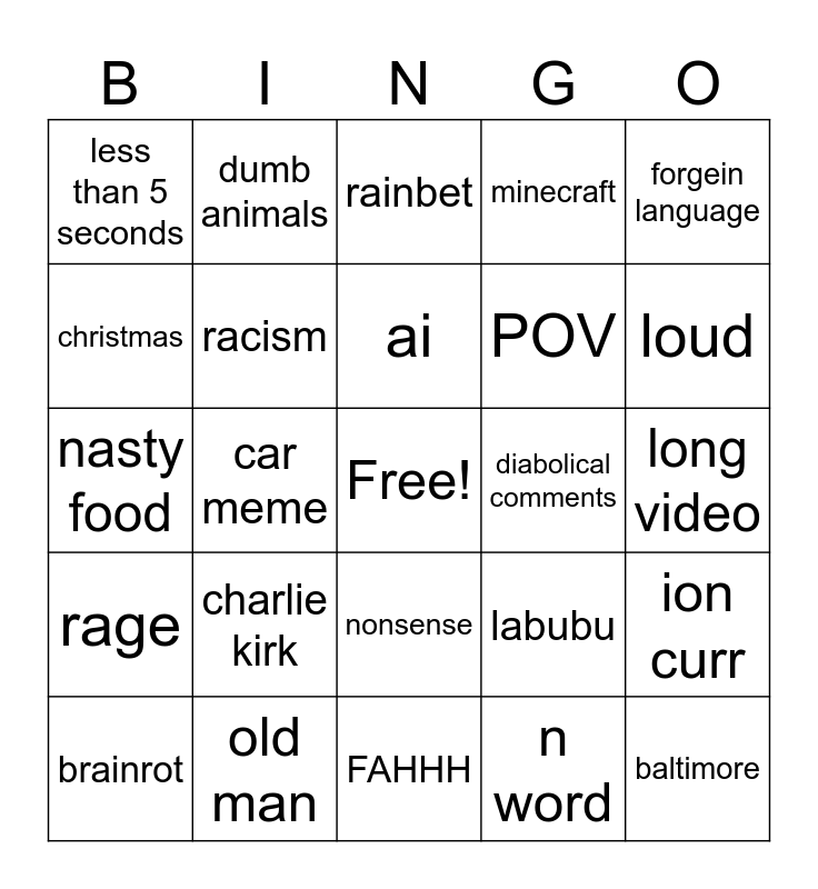 This bingo card has a free space and 24 words: charlie kirk, old man, ai, brainrot, forgein language, less than 5 seconds, christmas, dumb animals, diabolical comments, nonsense, POV, nasty food, labubu, ion curr, racism, n word, long video, rainbet, loud, car meme, baltimore, rage, minecraft and FAHHH.