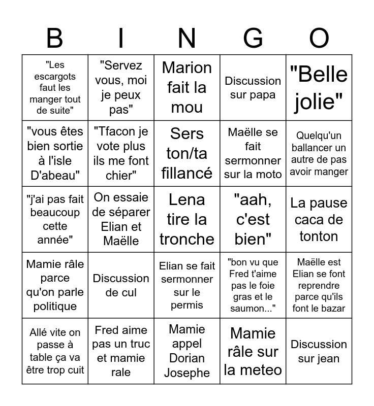 This bingo card has a free space and 24 words: Discussion de cul, Fred aime pas un truc et mamie rale, Sers ton/ta fillancé, Allé vite on passe à table ça va être trop cuit, "Belle jolie", "Les escargots faut les manger tout de suite", "vous êtes bien sortie à l'isle D'abeau", "Servez vous, moi je peux pas", "aah, c'est bien", Elian se fait sermonner sur le permis, Maëlle se fait sermonner sur la moto, "j'ai pas fait beaucoup cette année", "bon vu que Fred t'aime pas le foie gras et le saumon...", Maëlle est Elian se font reprendre parce qu'ils font le bazar, "Tfacon je vote plus ils me font chier", Mamie râle sur la meteo, La pause caca de tonton, Marion fait la mou, Quelqu'un ballancer un autre de pas avoir manger, On essaie de séparer Elian et Maëlle, Discussion sur jean, Mamie râle parce qu'on parle politique, Discussion sur papa and Mamie appel Dorian Josephe.