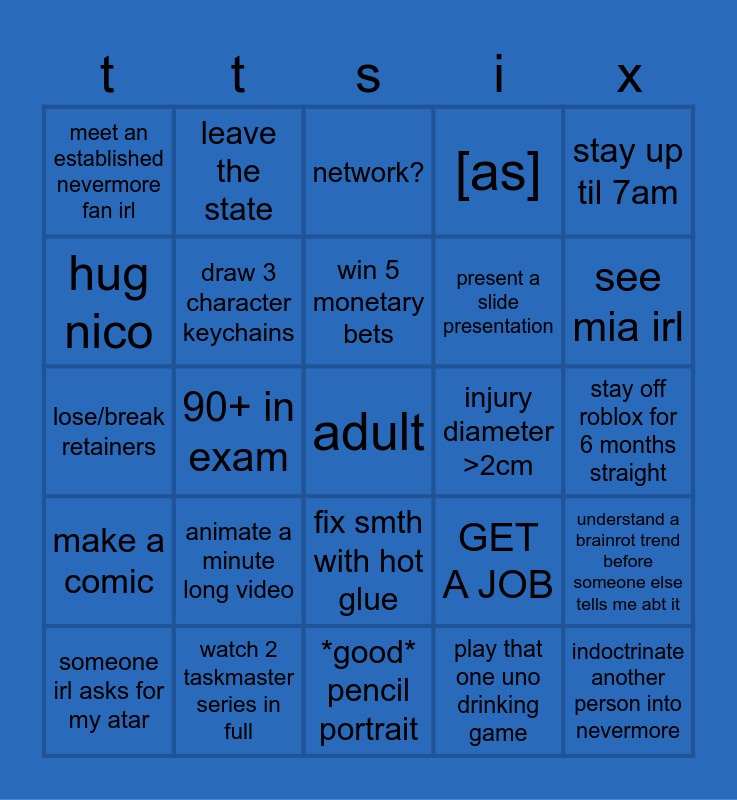 This bingo card has a free space and 24 words: someone irl asks for my atar, animate a minute long video, win 5 monetary bets, play that one uno drinking game, stay up til 7am, meet an established nevermore fan irl, leave the state, network?, injury diameter >2cm, stay off roblox for 6 months straight, lose/break retainers, draw 3 character keychains, GET A JOB, understand a brainrot trend before someone else tells me abt it, hug nico, watch 2 taskmaster series in full, *good* pencil portrait, [as], see mia irl, make a comic, 90+ in exam, fix smth with hot glue, present a slide presentation and indoctrinate another person into nevermore.