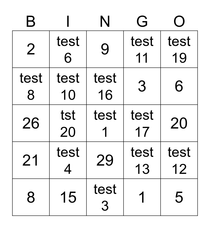 This bingo card has 51 words: Free!, test 1, test 2, test 3, test 4, test 5, test 6, test 7, test 8, test 9, test 10, test 11, test 12, test 13, test 14, test 15, test 16, test 17, test 18, test 19, tst 20, 1, 2, 3, 4, 5, 6, 7, 8, 9, 10, 11, 12, 13, 14, 15, 16, 17, 18, 19, 20, 21, 22, 23, 24, 25, 26, 27, 28, 29 and 30.