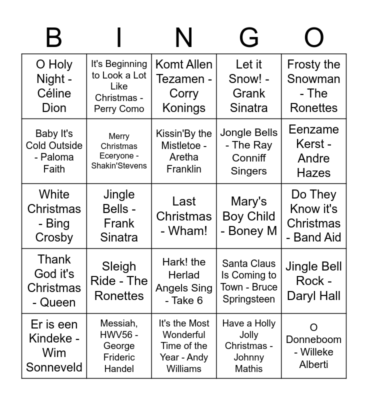 This bingo card has 51 words: All I Want for Christmas is You - Mariah Carey, Last Christmas - Wham!, Rocking'Around The Christmas Tree - Miley Cyrus, It's the Most Wonderful Time of the Year - Andy Williams, Sleigh Ride - The Ronettes, Feliz Navidad - Jose Feliciano, It's Beginning to Look a Lot Like Christmas - Perry Como, It's Gonna Be a Cold, Cold Christmas - Dana, Baby It's Cold Outside - Paloma Faith, Underneath the Tree - Kelly Clarkson, Merry Christmas Eceryone - Shakin'Stevens, Let it Snow! - Grank Sinatra, Jingle Bell Rock - Daryl Hall, Santa Claus Is Coming to Town - Bruce Springsteen, Driving Home for Christmas - Chris Rea, Silent Night - Zara Larsson, Kissin'By the Mistletoe - Aretha Franklin, Mary's Boy Child - Boney M, Do They Know It's Christmas - Band Aid, Frosty the Snowman - The Ronettes, Jingle Bells - Frank Sinatra, Have a Holly Jolly Christmas - Johnny Mathis, O Holy Night - Céline Dion, Jongle Bells - The Ray Conniff Singers, Frosty the Snowman - Willie Nelson, O Donneboom - Willeke Alberti, Eenzame Kerst - Andre Hazes, De Herdertjes Lagen Bij Nachte - Zangeres zonder naam, Er is een Kindeke - Wim Sonneveld, Komt Allen Tezamen - Corry Konings, Nu Syt Wellecome - Herman van Veen, Stille Nacht, Heilige Nacht - Willeke Alberti, T Is Geboren Het Godd Lijk Kind - Herman van Veen, Carol of the Bells - John Williams, Joy to the World - George Frideric Handel, Messiah, HWV56 - George Frideric Handel, Feliz Navidad - Jose Feliciano, Let It Snow! - Frank Sinatra, Santa Tell me - Ariana Grande, Rudolph the Red Nosed Reindeer - John Denver, Do They Know it's Christmas - Band Aid, Thank God it's Christmas - Queen, It's Beginning to look a lot like christmas - Michael Bublé, Feliz Navidad - Jose Feliciano, Flappie - Youp van't Hek, Stop the Cavalry - Jona Lewie, White Christmas - Bing Crosby, Silver Bells - Neil Diamond, Cold December Night - Michael Bublé, Hark! the Herlad Angels Sing - Take 6 and Jingle Bell Rock - Straight No Chaser.
