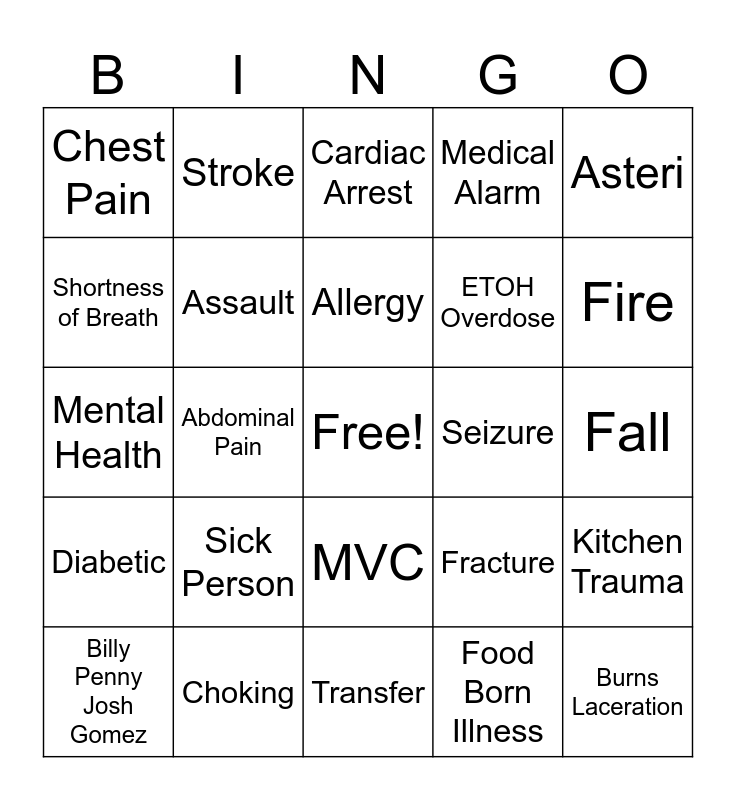 This bingo card has a free space and 24 words: Sick Person, Choking, Allergy, Billy Penny Josh Gomez, Asteri, Chest Pain, Shortness of Breath, Stroke, Seizure, MVC, ETOH Overdose, Mental Health, Fracture, Kitchen Trauma, Assault, Food Born Illness, Fall, Cardiac Arrest, Fire, Abdominal Pain, Burns Laceration, Diabetic, Medical Alarm and Transfer.