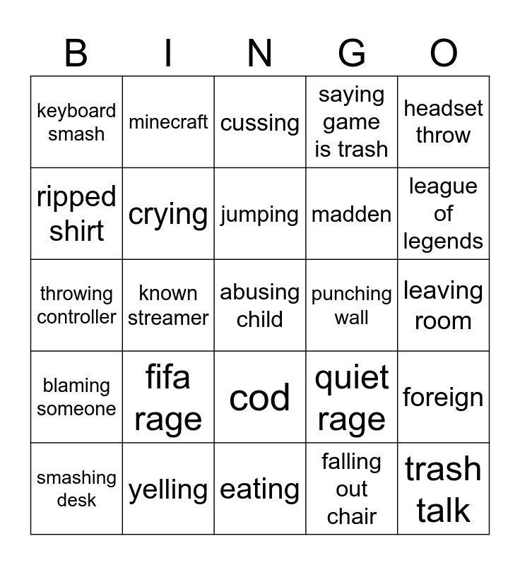 This bingo card has a free space and 24 words: fifa rage, yelling, jumping, smashing desk, headset throw, keyboard smash, ripped shirt, minecraft, punching wall, cod, madden, throwing controller, quiet rage, foreign, crying, falling out chair, leaving room, cussing, league of legends, known streamer, trash talk, blaming someone, saying game is trash and eating.