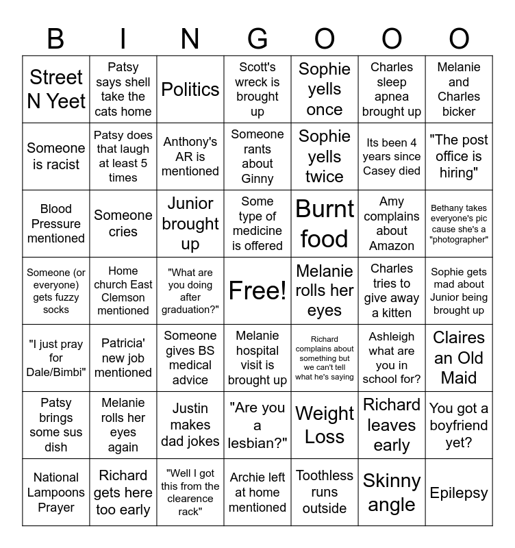 This bingo card has a free space and 48 words: Weight Loss, Its been 4 years since Casey died, Archie left at home mentioned, Home church East Clemson mentioned, Junior brought up, Sophie gets mad about Junior being brought up, Patsy says shell take the cats home, Richard gets here too early, Charles sleep apnea brought up, Melanie hospital visit is brought up, Melanie and Charles bicker, Scott's wreck is brought up, Amy complains about Amazon, Burnt food, Patsy brings some sus dish, Charles tries to give away a kitten, Someone is racist, "The post office is hiring", Richard leaves early, Sophie yells once, Sophie yells twice, "What are you doing after graduation?", Street N Yeet, Patsy does that laugh at least 5 times, You got a boyfriend yet?, Anthony's AR is mentioned, Bethany takes everyone's pic cause she's a "photographer", National Lampoons Prayer, Some type of medicine is offered, Someone cries, Skinny angle, Melanie rolls her eyes, Claires an Old Maid, Melanie rolls her eyes again, Someone (or everyone) gets fuzzy socks, Richard complains about something but we can't tell what he's saying, Ashleigh what are you in school for?, Blood Pressure mentioned, Someone gives BS medical advice, Justin makes dad jokes, "I just pray for Dale/Bimbi", Epilepsy, Politics, "Well I got this from the clearence rack", Someone rants about Ginny, "Are you a lesbian?", Patricia' new job mentioned and Toothless runs outside.