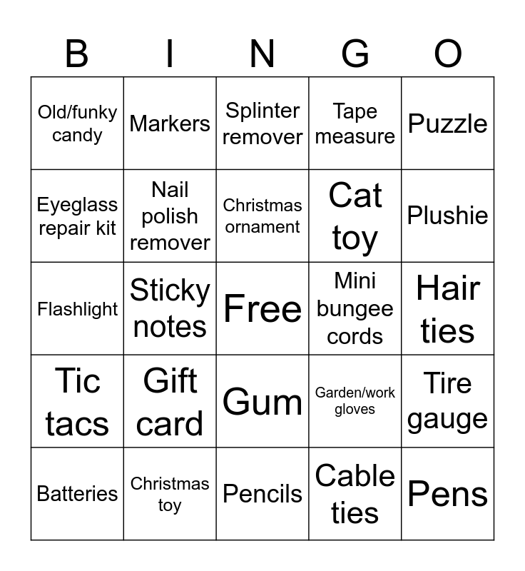 This bingo card has a free space and 31 words: Pencils, Rubber bands, Sticky notes, Makeup remover, Old/funky candy, Splinter remover, Nail polish remover, Garden/work gloves, Mini bungee cords, Cable ties, Hair ties, Pens, Sharpies, Tape, Plushie, Car air freshener, Tire gauge, Gift card, Tic tacs, Gum, Puzzle, Pez, Batteries, Markers, Cat toy, Eyeglass repair kit, Tape measure, Flashlight, Christmas toy, Christmas ornament and Socks.