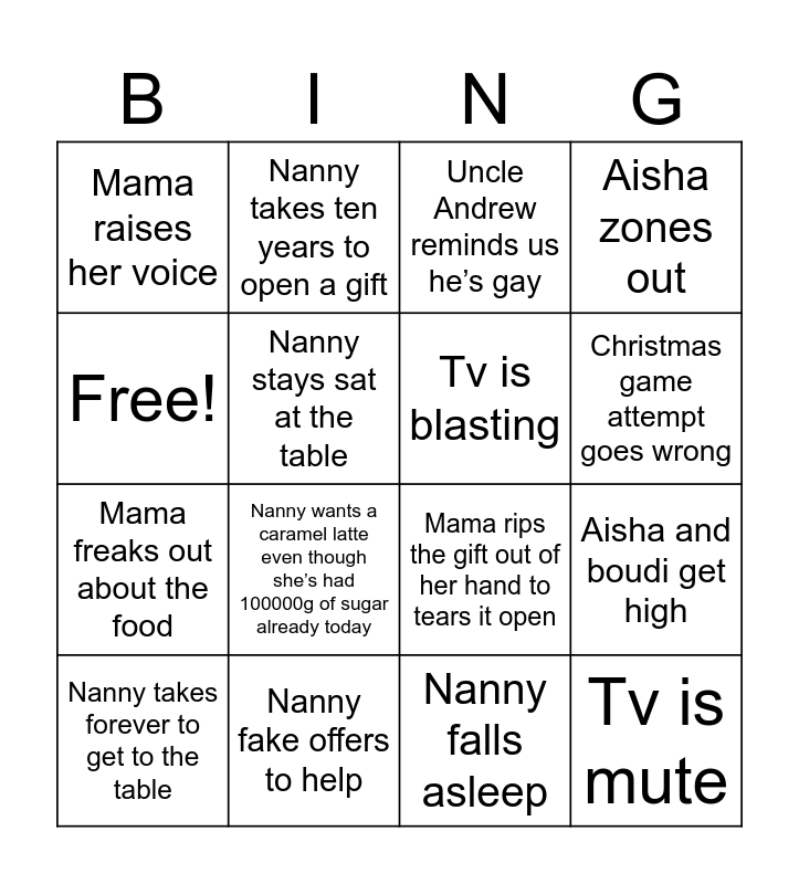 This bingo card has 16 words: Nanny fake offers to help, Aisha and boudi get high, Uncle Andrew reminds us he’s gay, Mama raises her voice, Mama freaks out about the food, Nanny takes ten years to open a gift, Mama rips the gift out of her hand to tears it open, Nanny falls asleep, Free!, Nanny stays sat at the table, Nanny takes forever to get to the table, Aisha zones out, Nanny wants a caramel latte even though she’s had 100000g of sugar already today, Christmas game attempt goes wrong, Tv is blasting and Tv is mute.