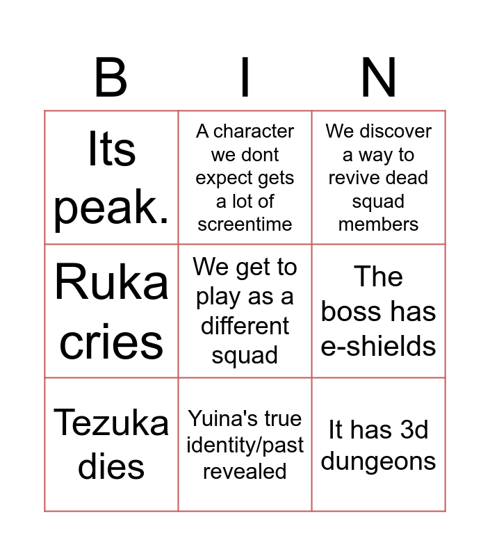 This bingo card has 9 words: Tezuka dies, We discover a way to revive dead squad members, A character we dont expect gets a lot of screentime, Ruka cries, Its peak., The boss has e-shields, We get to play as a different squad, It has 3d dungeons and Yuina's true identity/past revealed.