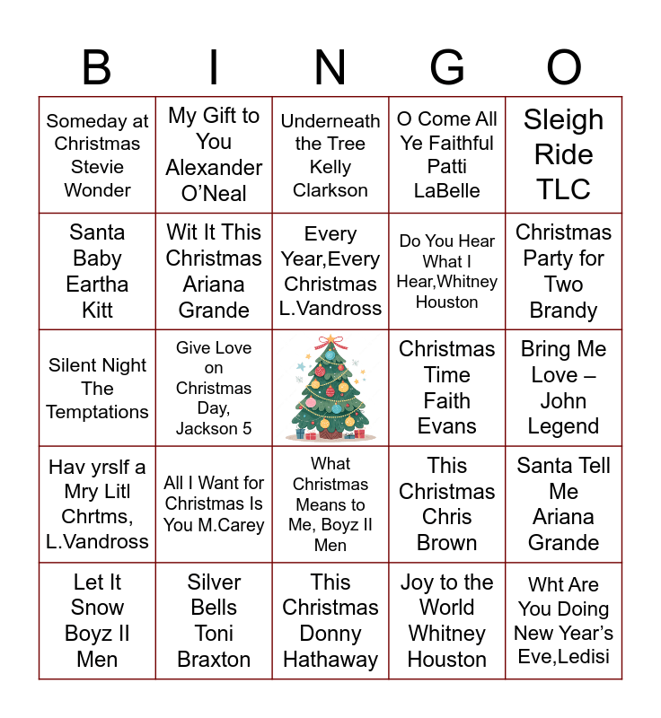 This bingo card has a free space and 25 words: All I Want for Christmas Is You M.Carey, This Christmas Donny Hathaway, Every Year,Every Christmas L.Vandross, Let It Snow Boyz II Men, Sleigh Ride TLC, Someday at Christmas Stevie Wonder, Santa Baby Eartha Kitt, My Gift to You Alexander O’Neal, Christmas Time Faith Evans, What Christmas Means to Me, Boyz II Men, Do You Hear What I Hear,Whitney Houston, Silent Night The Temptations, This Christmas Chris Brown, Santa Tell Me Ariana Grande, Wit It This Christmas Ariana Grande, Mistletoe Justin Bieber, Bring Me Love – John Legend, Underneath the Tree Kelly Clarkson, Christmas Party for Two Brandy, Give Love on Christmas Day, Jackson 5, Wht Are You Doing New Year’s Eve,Ledisi, Silver Bells Toni Braxton, Hav yrslf a Mry Litl Chrtms, L.Vandross, O Come All Ye Faithful Patti LaBelle and Joy to the World Whitney Houston.