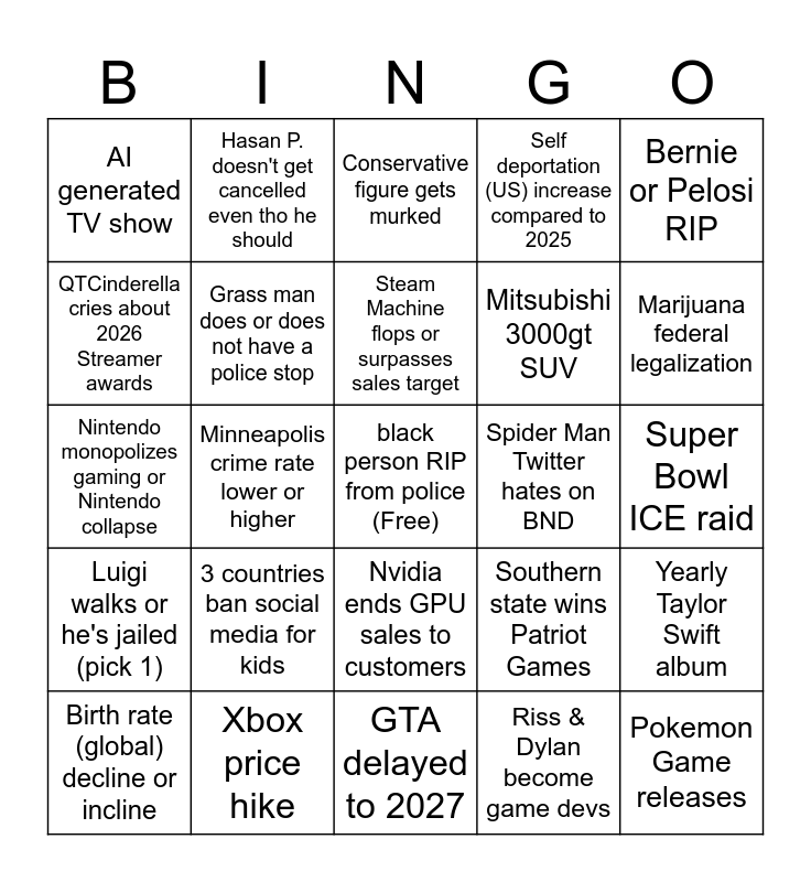 This bingo card has a free space and 28 words: Yearly Taylor Swift album, No Battinson 2, Mitsubishi 3000gt SUV, Riss & Dylan become game devs, QTCinderella cries about 2026 Streamer awards, Conservative figure gets murked, Hasan P. doesn't get cancelled even tho he should, Luigi walks or he's jailed (pick 1), Spider Man Twitter hates on BND, Birth rate (global) decline or incline, Nintendo monopolizes gaming or Nintendo collapse, Self deportation (US) increase compared to 2025, Xbox price hike, GTA delayed to 2027, Marijuana federal legalization, AI stock market crash, 3 countries ban social media for kids, Grass man does or does not have a police stop, Steam Machine flops or surpasses sales target, Nvidia ends GPU sales to customers, AI generated TV show, Blockbuster film massively underperforms at box office, Pokemon Game releases, Minneapolis crime rate lower or higher, Super Bowl ICE raid, Southern state wins Patriot Games, Bernie or Pelosi RIP and Elon becomes Trillionaire.