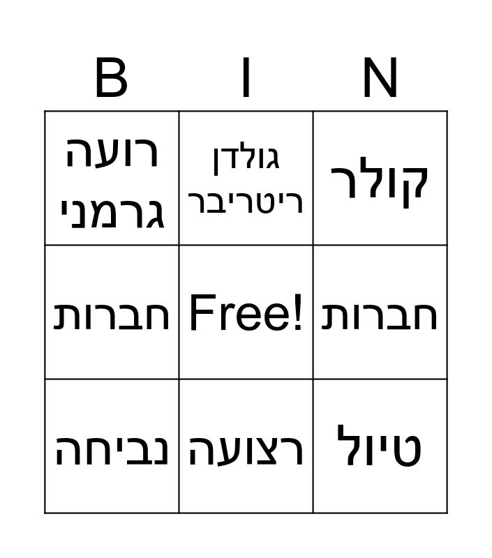 This bingo card has a free space and 20 words: גור, דלמטי, קולר, האסקי, פרווה, טיול, כלבים, רועה גרמני, עצם, גולדן ריטריבר, זנב, רחרוח, חברות, מלונה, נביחה, פודל, רצועה, חברות, שמירה and פודל.